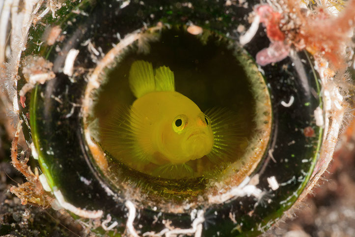 Yellow goby in beer bottle, Lembeh Strait, Indonesia